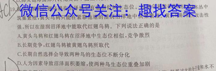 AC9.黄头乌鹩和红翅乌鹩在沼泽地中有着相似的生态位。红翅乌鹩能在湿润的草及道木从中筑巢繁殖,黄头乌鹩只能在紧靠池塘的湿润沼泽地中筑巢繁殖。黄头乌藕个体大,攻击性强,所以在湿润沼泽地中能取代红翅乌。下列说法正确的是A.黄头乌鹑和红翅乌鹩在沼泽地中生态位相似,竞争激烈B.长期竞争,红翅乌被黄翅乌所取代C.长期自然选择会导致两种鸟的生态位不断分化D.人为因素导致沼泽面积萎缩,使两种鸟生态位重叠加剧