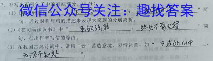 17.补写出下列句子中的空缺部分。(6分)(1)《项脊轩志》中“东大西吠”与“鸡栖于厅”两句,通过对狗与鸡的描述来表现大家族的分崩离析。(2)《答司马谏议书》中“虽欲强聒终必不蒙见察”两句,点出作者写信的缘由。(3)在我国古典诗词中,常用“云”营造意境、表情达意,如“只在此山中,云深不知处