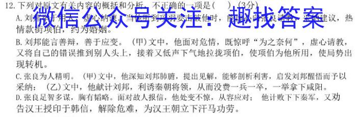 12.下列对原文有关内容的概括和分析,不正确的一项是()(3分)A.刘邦举于用人,虚心纳谏。当他听到项羽要击破他时,能虚心向张良请教,采纳建议,热情款街项伯,约为婚姻。B.刘邦能言善辩,善于应变。(甲)文中,他面对危情,既惊呼“为之奈何”,虚心请教又将自己的错误推到别人头上,接着又低声下气地拉拢项伯,使项伯为他所用,使局势出现转机。C.张良为人精明。(甲)文中,他深知刘邦肺腑,提出见解,能够剖析利害,启发刘邦醒悟而予以采纳:(乙)文中,他献计刘邦,利诱秦朝将领,从而没费一兵一卒,一举拿下咸阳。D.张良足智多谋,胸有韬略。面对故人报信,他处变不惊,从容应对;他计败下下秦军,又劝告汉王授印于韩信,解除危难,为汉王朝立下汗马功劳。