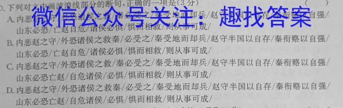 10.下列对文中画波浪线部分的断句,正确的一项是(3分)()A.内恶赵之守/外恐诸侯之救/秦必受之/秦受地而却兵/赵守半国以自存/秦衔赂以自强/山东必恐/亡赵自危/诸侯必惧/惧而相救/则从事可成/B.内恶赵之守/外恐诸侯之救秦/必受之/秦受地而却兵/赵守半国以自存/秦衔赂以自强/山东必恐/亡赵自危/诸侯必惧/惧而相救/则从事可成/C.内恶赵之守/外恐诸侯之救/秦必受之/秦受地而却兵/赵守半国以自存/秦衔赂以自强/山东必恐亡赵/自危诸侯/必惧/惧而相救/则从事可成/D.内恶赵之守/外恐诸侯之救秦/必受之/秦受地而却兵/赵守半国以自存/秦衔赂以自强/山东必恐亡赵/自危诸侯/必惧/惧而相救/则从事可成/