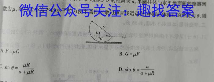 8.如图,半圆柱体重G,半径为R,重心C到圆心O的距离为a,半圆柱体与水平地面间的摩擦因数为,,当用大小为F的水平拉力使半圆柱体做匀速直线运动时,半圆柱体偏过的角度为θ,则CGA.F=B.G=C.=Ra+RD.=aa+R