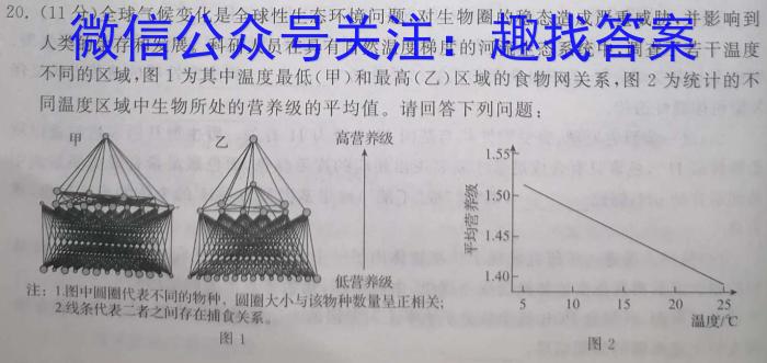 20.(11分)全球气候变化是全球性生态环境问题,对生物圈的稳态造成严重威胁,并影响到人类的生存和发展。科研人员在具有自然温度梯度的河流生态系统中,调查了若干温度不同的区域,图1为其中温度最低(甲)和最高(乙)区域的食物网关系,图2为统计的不同温度区域中生物所处的营养级的平均值。请回答下列问题:甲乙高营养级1.555个1.501.45低营养级1.400注:1.图中圆圈代表不同的物种,圆圈大小与该物种数量呈正相关;2.线条代表二者之间存在捕食关系。5101152202525温度图1图2