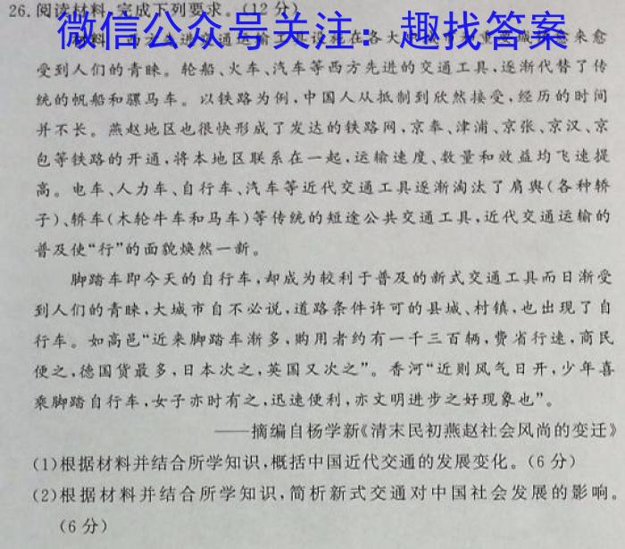 26.阅读材料,完成下列要求。(12分)材料西方先进交通运输工具设施在各大中城市和重要城镇愈来愈受到人们的青睐,轮船、火车、汽车等西方先进的交通工具,逐渐代替了传统的帆船和马车,以铁路为例,中国人从抵制到欣然接受,经历的时间并不长,燕赵地区也很快形成了发达的铁路网,京奉、津浦、京张、京汉、京包等铁路的开通,将本地区联系在一起,运输速度、数量和效益均飞速提高。电车、人力车、自行车、汽车等近代交通工具逐渐淘汰了肩舆(各种轿子)、轿车(木轮牛车和马车)等传统的短途公共交通工具,近代交通运输的普及使“行”的面貌焕然一新。脚踏车即今天的自行车,却成为较利于普及的新式交通工具而日渐受到人们的青睐,大城市自不必说,道路条件许可的县城、村镇,也出现了自行车。如高邑“近来脚踏车渐多,购用者约有一千三百辆,费省行速,商民便之,德国货最多,日本次之,英国又次之”。香河“近则风气日开,少年喜乘脚踏自行车,女子亦时有之,迅速便利,亦文明进步之好现象也”。——摘编自杨学新《清末民初燕赵社会风尚的变迁》(1)根据材料并结合所学知识,概括中国近代交通的发展变化。(6分)(2)根据材料并结合所学知识,简析新式交通对中国社会发展的影响。(6分)