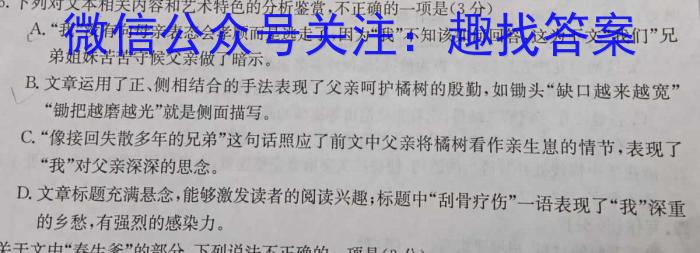6.下列对文本相关内容和艺术特色的分析鉴赏,不正确的一项是(3分)A.“我”没有向母亲表态会孝顺而是逃走了,因为“我”不知该如何回答,这为下文“我们”兄弟姐妹苦苦守候父亲做了暗示。B.文章运用了正、侧相结合的手法表现了父亲呵护橘树的殷勤,如锄头“缺口越来越宽”“锄把越磨越光”就是侧面描写。C.“像接回失散多年的兄弟”这句话照应了前文中父亲将橘树看作亲生崽的情节,表现了“我”对父亲深深的思念。D.文章标题充满悬念,能够激发读者的阅读兴趣;标题中“刮骨疗伤”一语表现了“我”深重的乡愁,有强烈的感染力。