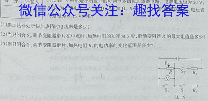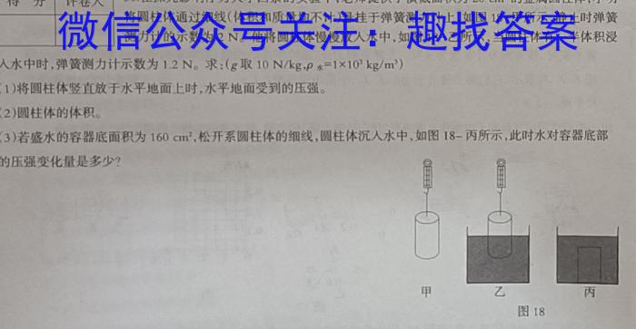 30.在探究影响浮力大小因素的实验中,老师提供了横截面积为20cm^2的金属圆柱体,小明将圆柱体通过细线(体积和质量均不计)悬挂于弹簧测力计上,如图18–甲所示,静止时弹簧测力计的示数为2N。他将圆柱体慢慢放入水中,如图18–乙所示,当圆柱体有一半体积浸入水中时,弹簧测力计示数为1.2N。求:(g取10N/kg,=110^3kg/m^3)(1)将圆柱体竖直放于水平地面上时,水平地面受到的压强。(2)圆柱体的体积。(3)若成水的容器底面积为160cm^2,,松开系圆柱体的细线,圆柱体沉入水中,如图18-丙所示,此时水对容器底部的压强变化量是多少?31.如图19所示是小明设计的可调节多挡位加热器电路。电源电压恒为20V,R1、R2为加热电阻,R1=10,R2=20,R为“x∩1A’”的滑动变阻器,电压表的量程为015V。求:(1)当加热器处于快加热挡时电功率是多少?(2)当只闭合S2,,调节变阻器滑片在中点时,加热电阻的功率为5W,,滑动变阻器R的最大阻值是多少?(3)当只闭合S1,,调节变阻器滑片,加热电阻R1的电功率的变化范围是多少?PRR2S3S1R1图19
