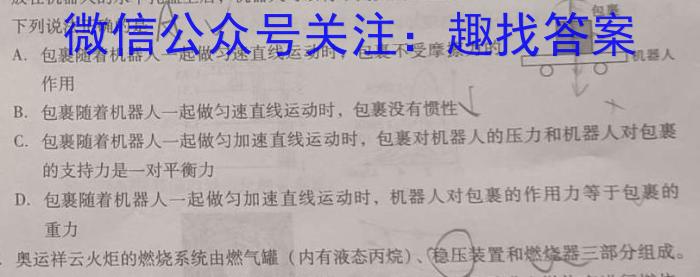 4.如图为广泛应用于“双11”的智能快递分拣机器人简化图,派件员在分拣场内将包裹放在机器人的水平托托盘上后,机器人可以将不同类别的包裹自动送至不同的位置,则下列说法正确的是AA.包裹随着机器人一起做匀速直线运动时,包裹不受摩擦力的作用B.包裹随着机器人一起做匀速直线运动时,包裹没有惯性C.包裹随着机器人一起做匀加速直线运动时,包裹对机器人的压力和机器人对包裹的支持力是一对平衡力D.包裹随着机器人一起做匀加速直线运动时,机器人对包裹的作用力等于包裹的重力