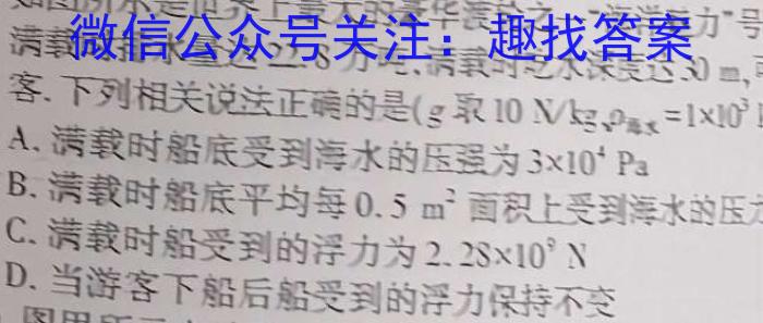 9.如图所示是世界上最大的豪华渡轮之一海洋运力”号满载时排水量达万吨,满载时吃水深度达3)m,客.下列相关说法正确的是(g取10N/s0=110^3A.满载时船底受到海水的压强为310^4PaB.满载时船底平均每0.5m^2面积上受到海水的压C.满载时船受到的浮力为2.28×10^9ND.当游客下船后船受到的浮力保持不变