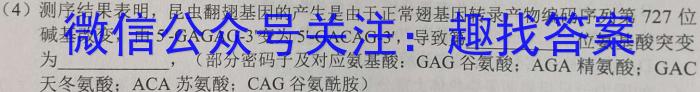 (4)测序结果表明,昆虫翻翅基因的产生是由于正常翅基因转录产物编码序列第727位碱基改变,由5′-GAGAG-3’变为5′-GACAG-3′,,导致第位氨基酸突变为,(部分密码子及对应氨基酸:GAG谷氨酸:AGA精氨酸:GAC天冬氨酸;ACA苏氨酸;CAG谷氨酰胺)