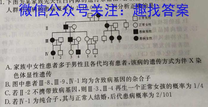 11.下图为某家族先天性白内障的遗传系谱图,若该性状由A、a基因控制,人群中该病的患病概率为1/10000。,下列分析正确的是]正常男性Ⅱ正常女性患病男性Ⅲ患病女性23456A.家族中女性患者多于男性且各代均有患者,该病的遗传方式为伴X染色体显性遗传B.图中患者Ⅲ-8、、Ⅲ-9、N-1均为含致病基因的杂合子C.若Ⅱ-2不携带致病基因,则Ⅲ-3、、Ⅲ-4再生一个正常女孩的概率为1/4D.若Ⅳ-1为纯合子,其与正常人结婚,后代患病概率为2/101