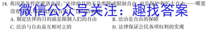 18.英国著名哲学家洛克说:“法律的目的不是废除或限制自由,而是保护和扩大自由……哪里没有法律,哪里就没有自由。”这句话表明()A.制定法律的目的就是限制人们的自由B.法治是自由的保障C.法治与自由是互相对立的D.法律保证公民各项权利的实现