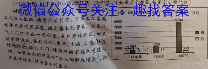 (2)选做题,以下两个小题,请任选一个作答。(如果两个都答,按第①小题计分)材料二19世纪40年代以前,工业国家工人收入低微,物质生活贫苦。许多工人家庭常年只能吃黑面包,缺乏基本的营养。全家几代十几口挤在一间小屋,虽然劳碌终日,却只债能求得温饱,遇到涨价、失业、生病、工伤,往往债务缠身除欠无门,连简陋的家具也送进当铺。而资本家的财富却“令人陶醉地增们生活悠闲,过着奢华的生活。