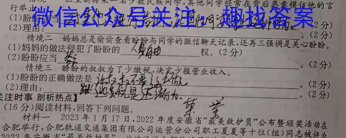 【情境探究学以致用】15.(12分)下面是初中生盼盼生活中的三个情境,请你运用所学知识对其进行探究。情境一~班里新转来一名少数民族同学,其他同学经常在背后恶意模仿他的言行举止。(1)盼盼应当对其他进行告训,让其他同学停止这种行为。(2分)。(2分)(2)理由:情境二妈妈总是偷偷查看盼分盼与同学的微信聊天记录,还再三强调是关心盼盼。(1)妈妈的做法侵犯了盼盼的人家自由权。(2分)(2)盼盼应当答。(2分)定少报营业收入。情境三盼盼分的叔叔为了少缴税,决定少报(1)盼盼的正确做法是叔不要这么做。。(2分)【关注时事剖析热点】16.(16分)阅读材料,回答下列问题。(2)理由:逃税是边。(2分)荣(1)材料一中夏夏等十位(组)“最美救护员”享受了权。(2分)●探究分析(2)