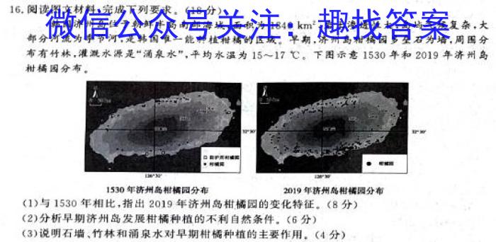 16.阅读图文材料,完成下列要求。(18分)韩国济州岛位于朝鲜半岛南部海域,面积为1846km^2,,岩土渗透性大,岛屿气候复杂,大部分河流为李节河,是韩国唯一能种植柑橘的区城早期,济州岛柑橘园多垒石为墙,周围分布有竹林,灌溉水源是“涌泉水”,平均水温为1517^C。。下图示意1530年和2019年济州岛柑橘园分布。1530年济州岛柑橘园分布2019年济州岛柑橘园分布(1)与1530年相比,指出2019年济州岛柑橘园的变化特征。(8分)(2)分析早期济州岛发展柑橘种植的不利自然条件。(6分)(3)说明石墙、竹林和涌泉水对早期柑橘种植的主要作用。(4分)
