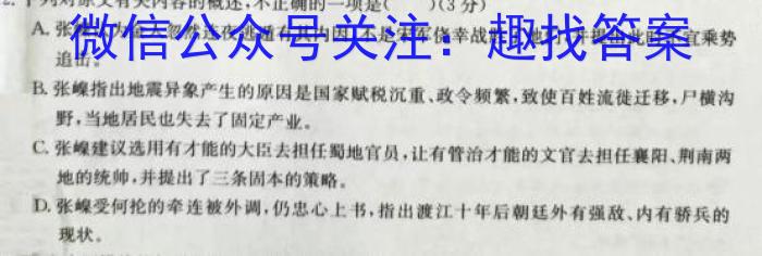 12.下列对原文有关内容的概述,不正确的一项是()(3分)A.张认为金人忽然连夜逃遁有其内因,不是宋军侥幸战胜了他们,并提出此时不宜乘势追击。B.张蝶指出地震异象产生的原因是国家赋税沉重、政令频繁,致使百姓流徙迁移,尸横沟野,当地居民也失去了固定产业。C.张螺建议选用有才能的大臣去担任蜀地官员,让有管治才能的文官去担任襄阳、荆南两地的统帅,并提出了三条固本的策略。D.张蝶受何抢的牵连被外调,仍忠心上书,指出渡江十年后朝廷外有强敌、内有骄兵的现状。
