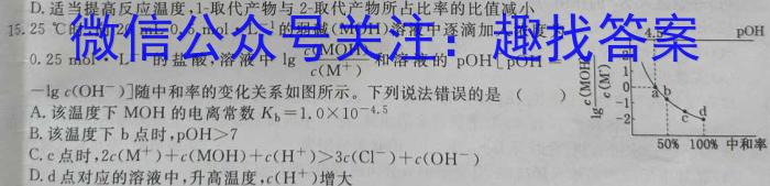 15.25^C时,向20mL0.5molL^-1的弱碱(MOH)溶液中逐滴加入浓度为0.25molL^-1的盐酸,溶液中c(MOH)c(M^+)和溶液的pOH[pOH=-c(OH^-)]随中和率的变化关系如图所示。下列说法错误的是()A.该温度下MOH的电离常数Kb=1.010^-4.5B.该温度下b点时,pOH>7C.c点时,2c(M^+)+c(MOH)+c(H^+)>3c(Cl^-)+c(OH^-)D.d点对应的溶液中,升高温度,c(H^+)增大