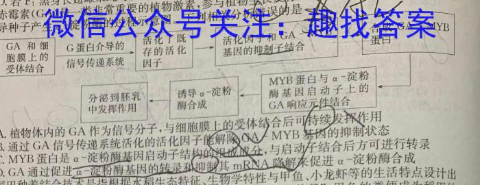 16.赤霉素(GA)是一类非常重要的植物激素,参与植物生长发育的多个过程。(GA)是导种子产生α一淀粉酶的过程示意图。下列相关分析错误的是活化了既GA-MYB活化因子和GAA→B合成GA-MYB蛋白基因的抑制子结合信号传递系统G蛋白介导的存的活化因子分泌到胚乳酶基因启动子上的中发挥作用诱导α-淀粉酶合成MYB蛋白与a-淀粉GA响应元件结合A.植物体内的GA作为信号分子,与细胞膜上的受体结合后可特续发挥作用B.通过GA信号传递系统活化的活化因子能解除GAMYB基因的抑制状态C.MYB蛋白是-淀粉酶基因启动子结构的成成分,与启动子结合后方可进行转录D.GA通过促进α-淀粉酶基因的转录和除制其mRNA降解来α-淀粉酶合成