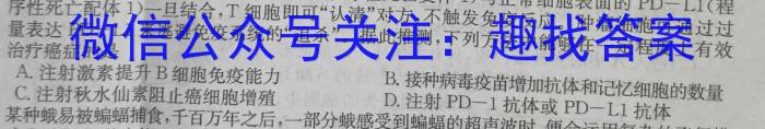 11.研究发现,活化的T细胞表面的PD-1(程序性死亡受体1)与正常细胞表面的PD一L1(程序性死亡配体1)一旦结合,T细胞即可“认清”对方,不触发免疫反应。肿瘤细胞可通过过量表达PD-L1来逃避免疫系统的“追杀”。据此推测,下列方法中能够在一定程度上有效治疗癌症的是A.注射激素提升B细胞免疫能力B.接种病毒疫苗增加抗体和记忆细胞的数量C.注射秋水仙素阻止癌细胞增殖D.注射PD-1抗体或PD一L1抗体