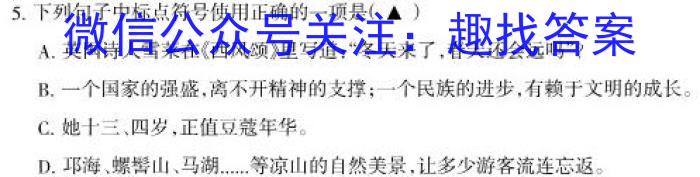 5.下列句子中标点符号使用正确的一项是(▲)A.英国诗人雪莱在《西风颂》里写道:“冬天来了,春天还会远吗”?B.一个国家的强盛,离不开精神的支撑;一个民族的进步,有赖于文明的成长。C.她十三、四岁,正值豆蔻年华。D.邳海、螺髻山、马湖…..等凉山的自然美景,让多少游客流连忘返。