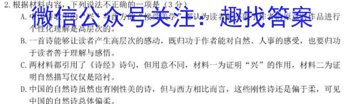 2.根据材料内容,下列说法不正确的一项是(3分)A.中国诗歌中的“兴”与西方的“接受美学”都认为读者能不限于作者的原意对作品进行个性化理解是高层次的。B.一首诗能够让读者产生高层次的感动,既归功于作者能对自然、人事的感受,也要归功于读者善于理解与感悟。C.两材料都引用了《诗经》诗句,但用意不同,材料一为证明“兴”的作用,材料二为证明自然描写仅仅是陪衬。D.中国的自然诗虽然也有刚性美的诗,但与西方相比而言,这些刚性诗还是偏于柔,可见中国的自然诗总体偏柔。