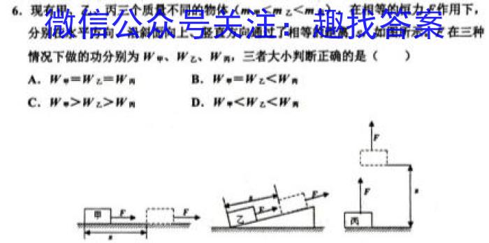 6.现有甲、乙、丙三个质量不同的物体(m甲<m乙<m),,在相等的恒力F作用下,分别在水平方向、沿斜面向上、竖直方向通过了相等的距离s,如图所示。F在三种情况下做的功分别为W甲、W乙、Wm,,三者大小判断正确的是()A.W甲=W乙=WB.W甲=W乙W乙>WD.W甲<W乙<Wn