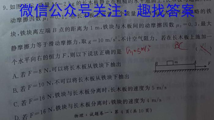 9.如图所示,质量M=2kg的长木板静止在粗糙的水平地面上,长木板与地面间的m=1kg,大小可以忽略的铁块,铁块离左端2=0.3,最大静摩擦力等于滑动摩擦力,取g=1)F=8N,动摩擦因数1=0.1。,在长木板上放置一个质量B点的距离为1m,铁块与木板间的动摩擦因数m/s²,不计空气阻力。若在长木板上施加一个水平向右的恒力F,则以下说法正确的是G1=5m/33C(F=8N,可以将长木板从铁块下抽出BmAFA.若B.若F=10N,N,不可以将长木板从铁块下抽出5m/s6N,铁块与长木板分离时,长木板的速度为5m/s物理·试题卷一·第4页(共10页)C.若FF=16N,4m/sN,,铁块与长木板分离时,铁块的速度为4m/s6ND.若F=16N,