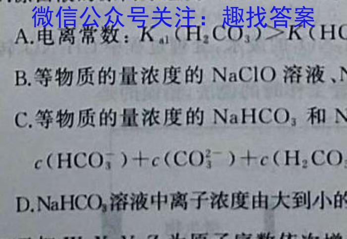 7.漂白液的漂白原理为NaClO+CO2A.电离常数:Ka1(H2CO3)>K(HB.等物质的量浓度的NaClO溶液、C.等物质的量浓度的NaHCO3,和c(HCO3^-)+c(CO3^2-)+c(H2COD.NaHCO3溶液中离子浓度由大到小的