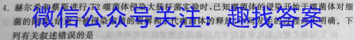 4.赫尔希和蔡斯进行T2噬菌体侵染大肠杆菌实验时,已知噬菌体的侵染开始于噬菌体对细菌的附着,结束于被侵染细菌的裂解和子代噬菌体的释放,中间发生的过程尚不明确。下列有关叙述错误的是A.赫尔希和蔡斯的实验间接为噬菌体優染倌主的过程提供了依据B.T2噬菌体的遗传物质必须进人大肠杆菌中发挥作用C.赫尔希和蔡斯使用了放射性同位素标记法D.,该实验证明了DNA是T2噬菌体的主要遗传物质