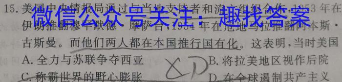 15.美国中央情报局通过与当地支持者和流亡组织合作,1953年在伊朗推翻穆罕默德·摩萨台,1954年在危地马拉推翻阿本斯古斯曼。而他们两人都在本国推行国有化。这表明,当时美国A.全力与苏联争夺西亚B.将拉美地区视作后院C.称霸世界的野心膨胀cDD.在全球遏制共产主义