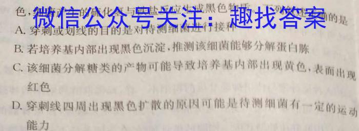 色,细菌产生的硫化氢与铁盐反应生成黑色物质。下列叙述正确的是A.穿刺或划线的目的是对待测细菌进行接种B.若培养基内部出现黑色沉淀,推测该细菌能够分解蛋白陈C.该细菌分解糖类的产物可能导致培养基内部出现黄色,表面出现红色D.穿刺线四周出现黑色扩散的原因可能是待测细菌有一定的运动能力