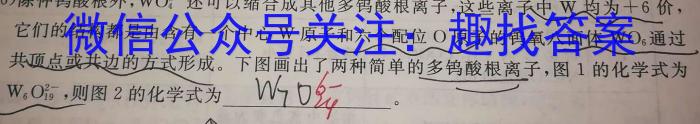 (6)除仲钨酸根外,WO4^2-还可以缩合成其他多钨酸根离子,这些离子中W均为十6价,它们的结构都是由含有一个中心W原子和六个配位O原子的钨氧八面体WO6通过共顶点或共边的方式形成。下图画出了两种简单的多钨酸根离子,图1的化学式为W6O19^2-,则图2的化学式为WSO。