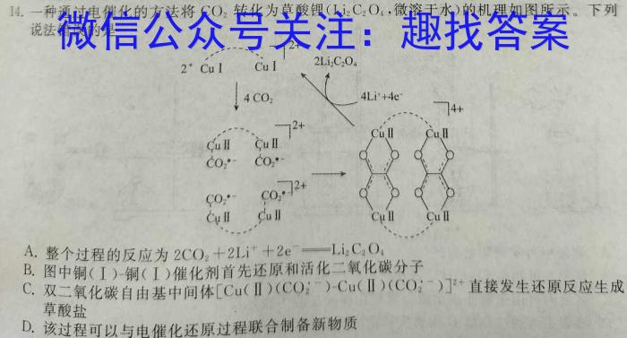 14.一种通过电催化的方法将CO2转化为草酸锂(Li2C2O4,微溶于水)的机理如图所示。下列说法错误的是A.整个过程的反应为2CO+2Lit+2e-LiCO.2CO2+2Li^++2e^-Li2C2O4B.图中铜(I)-铜(I)催化剂首先还原和活化二氧化碳分子C..双二氧化碳自由基中间体[Cu(Ⅱ)(CO:)-Cu((Ⅱ)(C([Cu(H)(CO2^-)-Cu(H)(CO2^-)]^2+*直接发生还原反应生成草酸盐D.该过程可以与电催化还原过程联合制备新物质