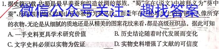 1.据史籍记载,古蜀是最早养蚕和织造丝绸的部族。“蜀”字在《说文》中被释义为“葵中蚕”,所以四川地区的蜀山氏亦被称为蚕丛氏。而近年在三星堆出土的青铜立人像所穿的衣物,无论是从细腻的质地还是从精美的图案花纹来看,都是高级丝织品。据此可知A.一手史料更具学术研究价值B.历史结论随着时代发展而变化C.文字史料必须以实物为佐证D.实物史料增强了文献的可信度