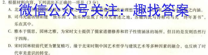 2.根据材料内容,下列说法不正确的一项是(3分)A.北宋文人所造园林是儒思与大雅之结合,寄托着他们的政治理想,体现了以诗礼义乐为本的雅之内涵。B.司马光退居洛阳建“独乐园”,独乐园也成了司马光著述之地,苏辙因此写诗称司马光“终年著书”,乐在其中。C.雅本于儒思,园林之雅,为宋时文士提供了儒家道德修养和君子性情涵泳的场所,但目的是发则浩然行于四海。D.宋时园林较前代更为繁复精巧,缘于北宋时期中国艺术哲学与建筑艺术等多种因素的融合,也反映了时代审美意识的转变。