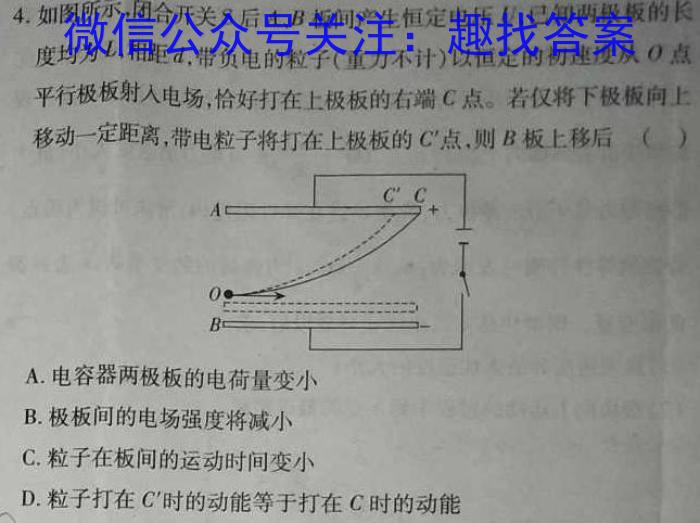 4.如图所示,闭合开关S后A、B板间产生恒定电压U,已知两极板的长L,度均为L,相距d,带负电的粒子(重力不计)以恒定的初速度从0点平行极板射入电场,恰好打在上极板的右端点。若仅将下极板向上移动一定距离,带电粒子将打在上极板的C’点,则B板上移后()A.电容器两极板的电荷量变小B.极板间的电场强度将减小C.粒子在板间的运动时间变小D.粒子打在C时的动能等于打在C时的动能