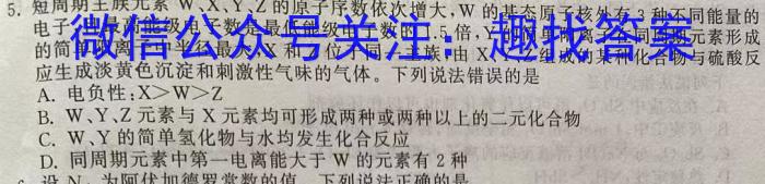 5.短周期主族元素W、X、Y、Z的原子序数依次增大,W的基态原子核外有3种不同能量的电子,且最高能级电子数是最低能级电子数的1.5倍,Y的简单阳离子在同周期元素形成的简单阳离子中半径最大,X和Z位于同一主族,由X、Y、Z组成的某种化合物与硫酸反应生成淡黄色沉淀和刺激性气味的气体。下列说法错误的是A.电负性:X>W>ZB.W、Y、Z元素与X元素均可形成两种或两种以上的二元化合物C.W、Y的简单氢化物与水均发生化合反应D.同周期元素中第一电离能大于W的元素有2种NA为阿伏加德罗常数的值。下列说法正确的是