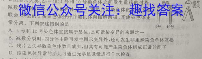 5.如图表示人类(2n=46)4号和10号染色体之间发生重接的过程。减数分裂时,4号、10号染色体分别与重接后的染色体的同源区段联会,联会的3条染色体分开并随机移向细胞两极,其他染色体正常分离。下列叙述错误的是A.4号和10号染色体重接属于易位,是可遗传变异的来源之一B.减数分裂时,四分体中除可发生图示变异外,还可发生非姐妹染色单体互换C.残片丢失导致染色体数目减少,但其有可能产生染色体组成正常的配子D.该染色体异常的胎儿可通过光学显微镜进行羊水检查