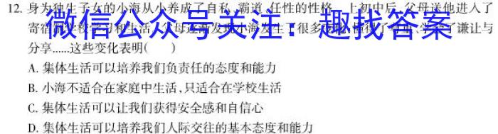 12.身为独生子女的小海从小养成了自私、霸道、任性的性格。上初中后,父母送他进人了寄宿制学校学习和生活。父母逐渐发现小海发生了很多变化:懂得了尊重、学会了谦让与分享…这些变化表明()A.集体生活可以培养我们负责任的态度和能力B.小海不适合在家庭中生活,只适合在学校生活C.集体生活可以让我们获得安全感和自信心D.集体生活可以培养我们人际交往的基本态度和能力