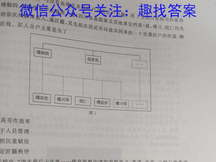 5.从明初开始,,不不少匠户傅朝四、倪普用用5.从明初开始,不少匠户与没有血缘关系的匠户合充匠户户籍。图1为四川布政司织染局合户庆州户户户籍州新机匠傅朝四、倪普用合户示意图。据(四川各地勘案及其他事宜档册》载,傅习、倪仁均为图1津1为内四川布政他成都府崇庆州新津县人,属匠籍,其先祖在洪武年间就共同承担一个世袭匠户的织造、解染局运等匠役。匠人合户主要是为了事倪仁共世袭档册》载,傅仁均为承担一个世匠户户的织造、解傅朝四倪普用傅添伦傅兴等傅廷价傅习等图1A.提高劳作效率B.便于人员管理C.分担沉重赋役D.稳定匠籍秩序