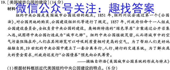 19.[美国城市公园的建设](14分)材料纽约中央公园是美国城市公园运动的起点。1851年,纽约州议会通过第一个《公园法》,对公园用地的购买、公园建设组织化等进行了规定。1857年,州政府任命十一人组成公园建设委员会,全权负责中央公园的建设。奥姆斯特德的“绿色草原”方案通过公开召集入选,试图将中央公园打造成为“城市之肺”。纽约中央公园植被茂密,从而将城市中的空气污染阻隔在外,人们在其间游览可以呼吸到质量相对更高的空气。为了帮助人们更好地接触自然,19世纪的中央公园中建立了一套分离车行、人行、骑行的交通系统。为了解决庞大的资金需求,州政府还发行“公园债券”预先向公民筹资。——摘编自许浩《美国城市公园系统的形成与特点》(1)根据材料概括近代美国纽约中央公园建设的特点。(6分)