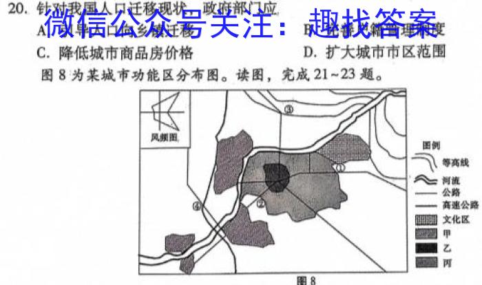 20.针对我国人口迁移现状,政府部门应A.引导人口向乡镇迁移B.完善户籍管理制度C.降低城市商品房价格D.扩大城市市区范围图8为某城市功能区分布图。读图,完成21~23题。