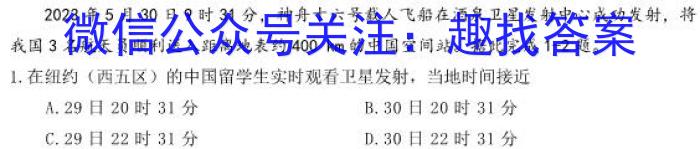 2023年5月30日9时31分,种舟十六号载人飞船在酒泉卫星发射中心成功发射,将我国3名航天员顺利送入距离地表约400km的中国空间站。据此完成1-2题。1.在纽约(西五区)的中国留学生实时观看卫星发射,当地时间接近A.29日20时31分B.30日20时31分C.29日22时31分D.30日22时31分