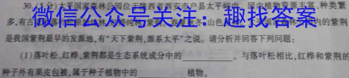 30.(5分)太平国家森林公园位于陕西省西安市户县太平峪内。园内植物资源丰富、种类繁多,有古老的落叶松原始纯林、红桦纯林、紫荆。春夏秋冬,山色各异。太平国家森林公园内的紫荆是我国紫荆最早的发源地,有“天下紫荆,源系太平”之说。请分析并回答下列问题:(1)落叶松、红桦、紫剂都是生态系统成分中的。与落叶松相比,红桦和紫荆的种子外有果皮包被,属于种子植物中的植物。