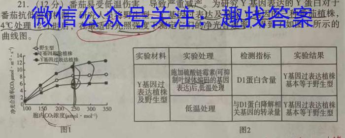 221.(12分)番茄易受低温伤害,导致严重减产。为研究Y基因表达的¥蛋白对干番茄抗低温的机制,研究人员将野生型、Y基因过表达及敲除Y基因的三种番茄植株,处理12小时后,在最适的光照强度下测定它们的净光合速率,得到了如图1所示的曲线图。图2mol时,若突然增大光强,叶绿体内C3含量将个不变原因是