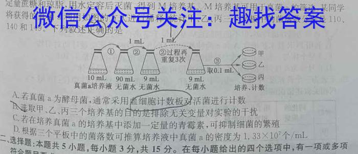 15.将马铃薯去皮切块,加水煮沸一定时间,过滤得到马铃薯浸出液。在马铃薯浸出液中加入一定量蔗糖和琼脂,用水定容后灭菌,得到M培养基。M培养基可用于真菌a的筛选,某同学将获得的真菌a利用如图的方式进行稀释,统计甲、乙、丙三个平板中的菌落数分别是110、A.若真菌a为酵母菌,通常采用血细胞计数板对活菌进行计数则BB.选取甲、乙、丙三个培养基的自的是排除无关变量对实验的干扰C.若在培养真菌a的培养基中添加一定量的青霉素,可抑制细菌的繁殖1.3310^7/mLD.根据三个平板中的菌落数可推算培养液中真菌a的密度为1.33×107个/mL