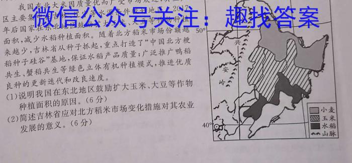 20.阅读图文材料,回答下列问题。(12分)我国东北大米因质量优而广受市场欢迎,其生产区主要集中在吉林、辽宁等水源条件较好地区。2017年后国家在东北地区鼓励扩大玉米、大豆等作物种植面积,减少水稻种植面积。随着北方稻米市场份额越来越少,吉林省从种子抓起,重点打造了“中国北方粳稻种子硅谷”基地,保证水稻产品质量;广泛推广鸭稻共生、蟹稻共生等绿色立体有机种植模式,推进优质良种的更新迭代和改良速度。120^130^(1)说明我国在东北地区鼓励扩大玉米、大豆等作物种植面积的原因。(6分)(2)简述吉林省应对北方稻米市场变化措施对其农业发展的意义。(6分)