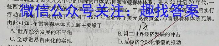 14.二战后确立了以美元为中心的国际货币体系,即布雷顿森林体系。进入20世纪70年代,一些西方国家要求美元贬值并兑换黄金,美国不予理睬。于是,德、意、比、荷、日等国先后实行浮动汇率制。在此情况下,美国于1971年宣布停止美元兑换黄金,布雷顿森林体系瓦解。由此可知,布雷顿森林体系瓦解主要缘于月A.世界经济发展的不平衡B.第三世界经济发展的冲击C.全球贸易自由化的实现D.反经济全球化浪潮的推动