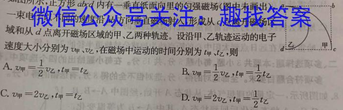 4.如图所示,正方形abcd内有一垂直纸面向里的匀强磁场(图中未画出),),一束电子以不同的速度沿ab方向垂直磁场射人,形成从c点离开磁场区域和从d点离开磁场区域的甲、乙两种轨迹。设沿甲、乙轨迹运动的电子速度大小分别为甲、V,在磁场中运动的时间分别为t甲、t,则A.v甲=12v乙,t甲=t乙B.v甲=12v乙,t甲=12tC.v甲=2v乙,t甲=t乙D.v甲=2v乙,t甲=12t乙