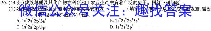 20.(14分)碳族单质及其化合物在科研和工农业生产中有着广泛的应用。回答下列问题:1)(1)处于激发态的碳原子的电子排布式可表示为(填字母),碳原子从基态变为激发态,需要(填“吸收”或“放出”)能量。A.1s^22s^22p^13s^1B.1s^22s^22p^23s^1C.1s^22s^22p^13p^1D.1s^22s^22p^1