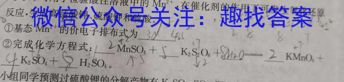 (1)K2S2O8可用于检验酸性溶液中的Mn^2+,在催化剂的作用下可发生氧化还反反应,生成高锰酸钾、硫酸钾和硫酸。13(2935S个3045²①基态Mn^2+的价电子排布式为3d4²2882++7②完成化学方程式:MnSO4+I+5K,K2S2O8H2O2KMnO4+4K2SO4+8H2SO4。
