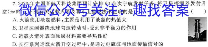 7.2023年中国某航天科技集团预计安排60余次宇航发射任务,将卫星探测器发射升空(如图)。下列有关运载火箭及北斗卫星说法不正确的是A.火箭使用液氢燃料,主要是利用了液氢的热值大B.卫星探测器绕地球匀速转动时,受到非平衡力的作用C.运载火箭外表面涂层材料需要导热性好D.长征系列运载火箭升空过程中,是通过电磁波与地面传输信号的